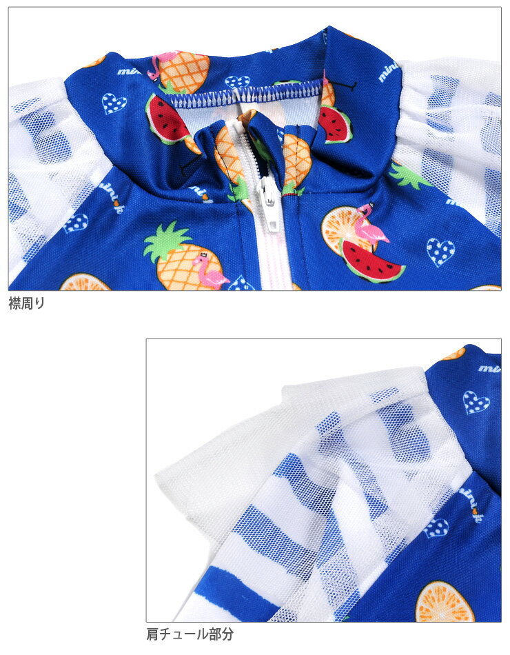 mini-k キッズ用長袖ラッシュガード水着 110 120 ミニケー 33750416 ジップアップ 紫外線防止 UV 日焼け防止 子供 子ども 女児 おんなのこ 長そで フリル チュール レース パイナップル スイカ フラミンゴ ハート オレンジ フルーツ 青 ブルー あす楽 メール便送料無料